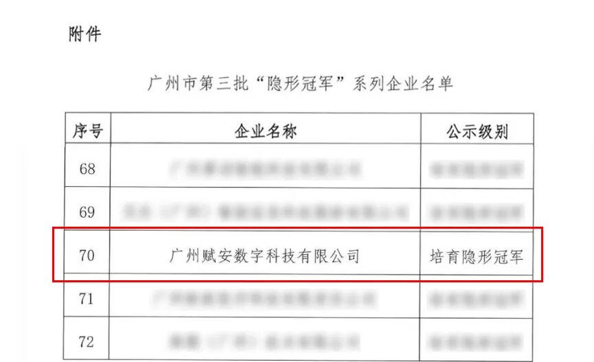 近日,广州市产业招商投资促进会公布了广州市第三批“隐形冠军”企业名单。广州赋安凭借深耕自然资源细分领域的丰富项目经验、深厚技术积累以及行业影响力等实力入选为“培育隐形冠军”企业。
